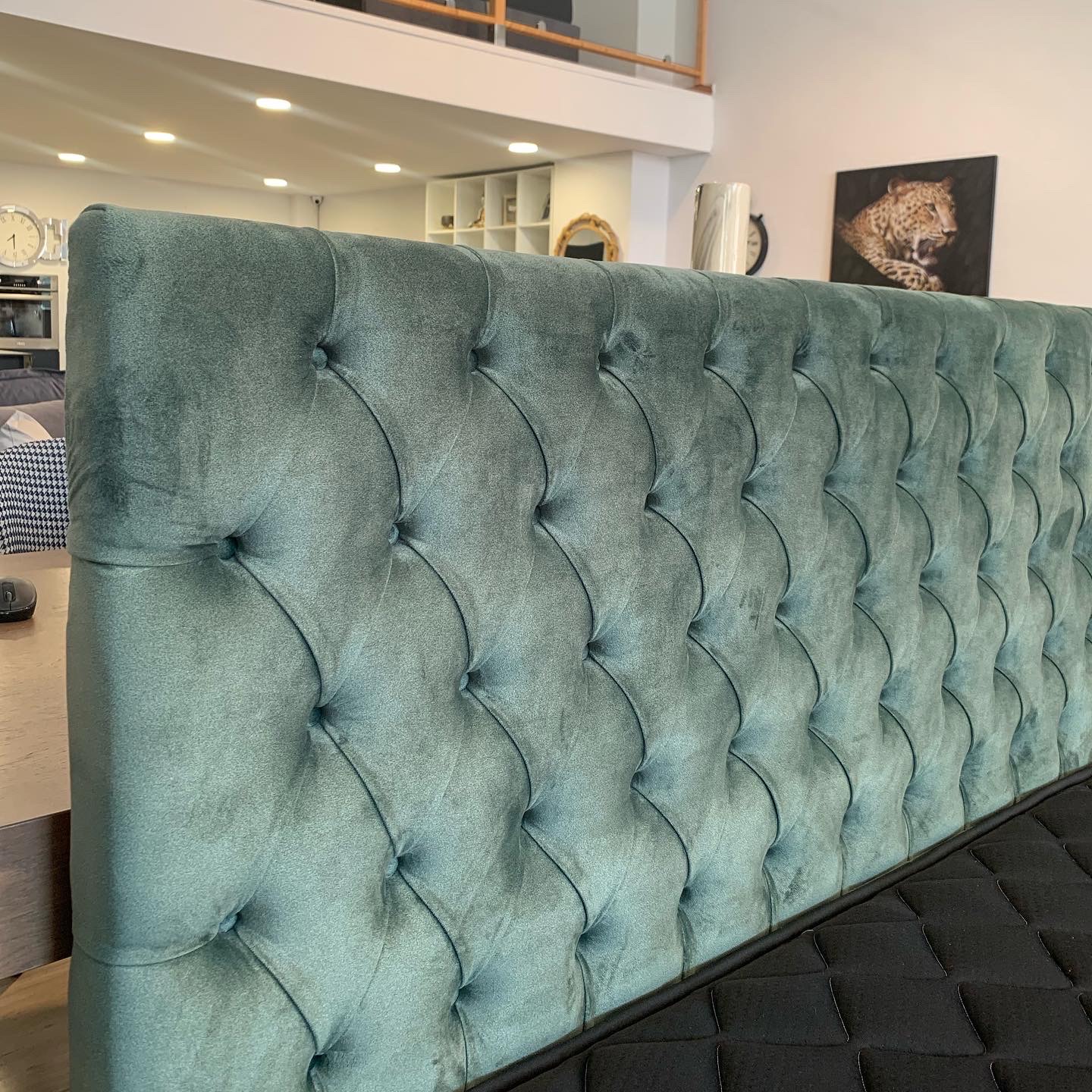 Κρεβάτι Alkioni Bukle στιβαρή κατασκευή με 12 πόδια στην βάση του και μεταλλική βάση από στρατζαριστο σίδερο επενδεδυμένο με ξύλινο τελάρο και ύφασμα αλέκιαστο.