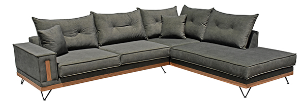 Γωνιακός καναπές με ξύλινα στοιχεία στη βάση και το μπράτσο.