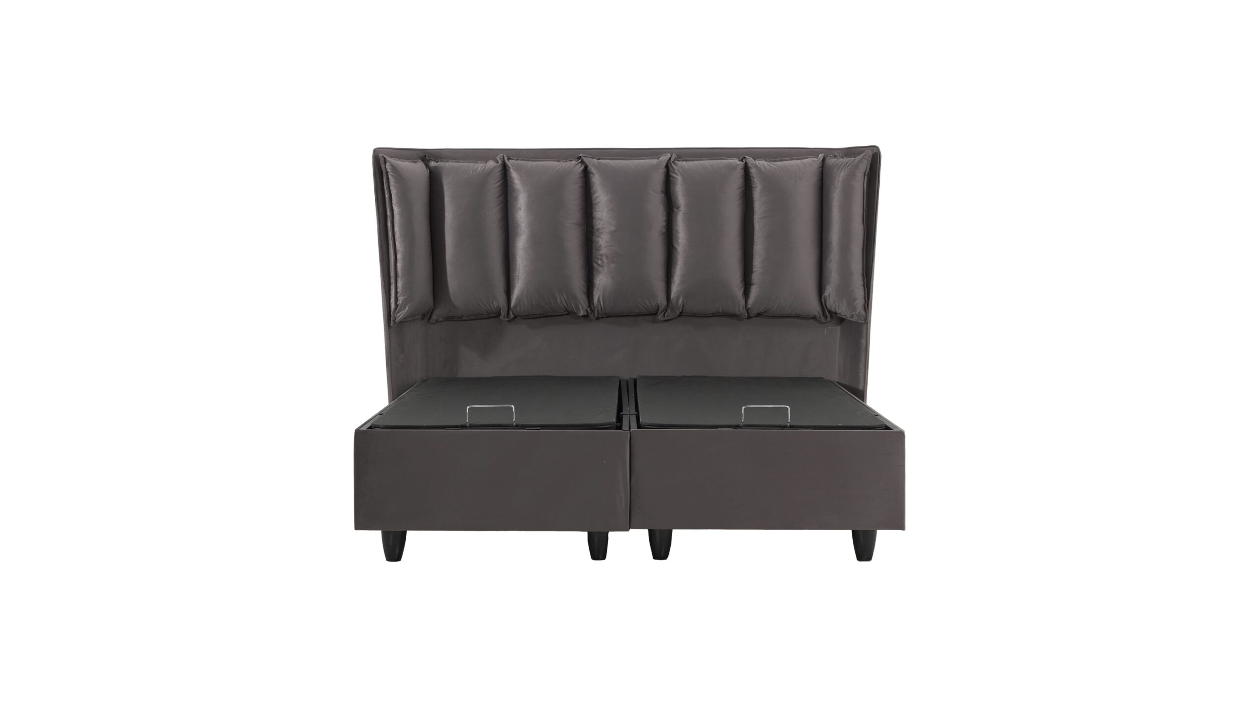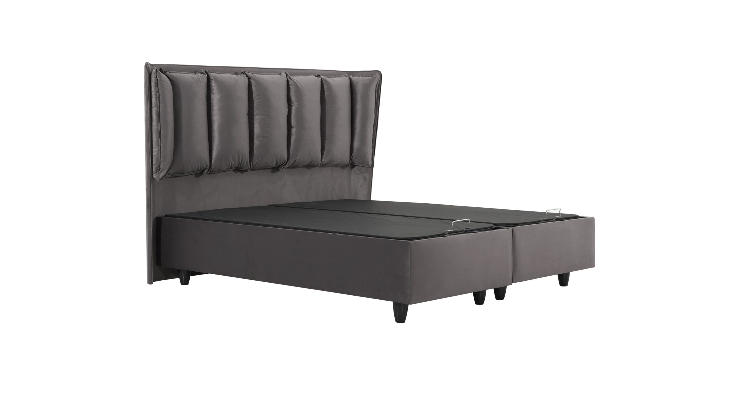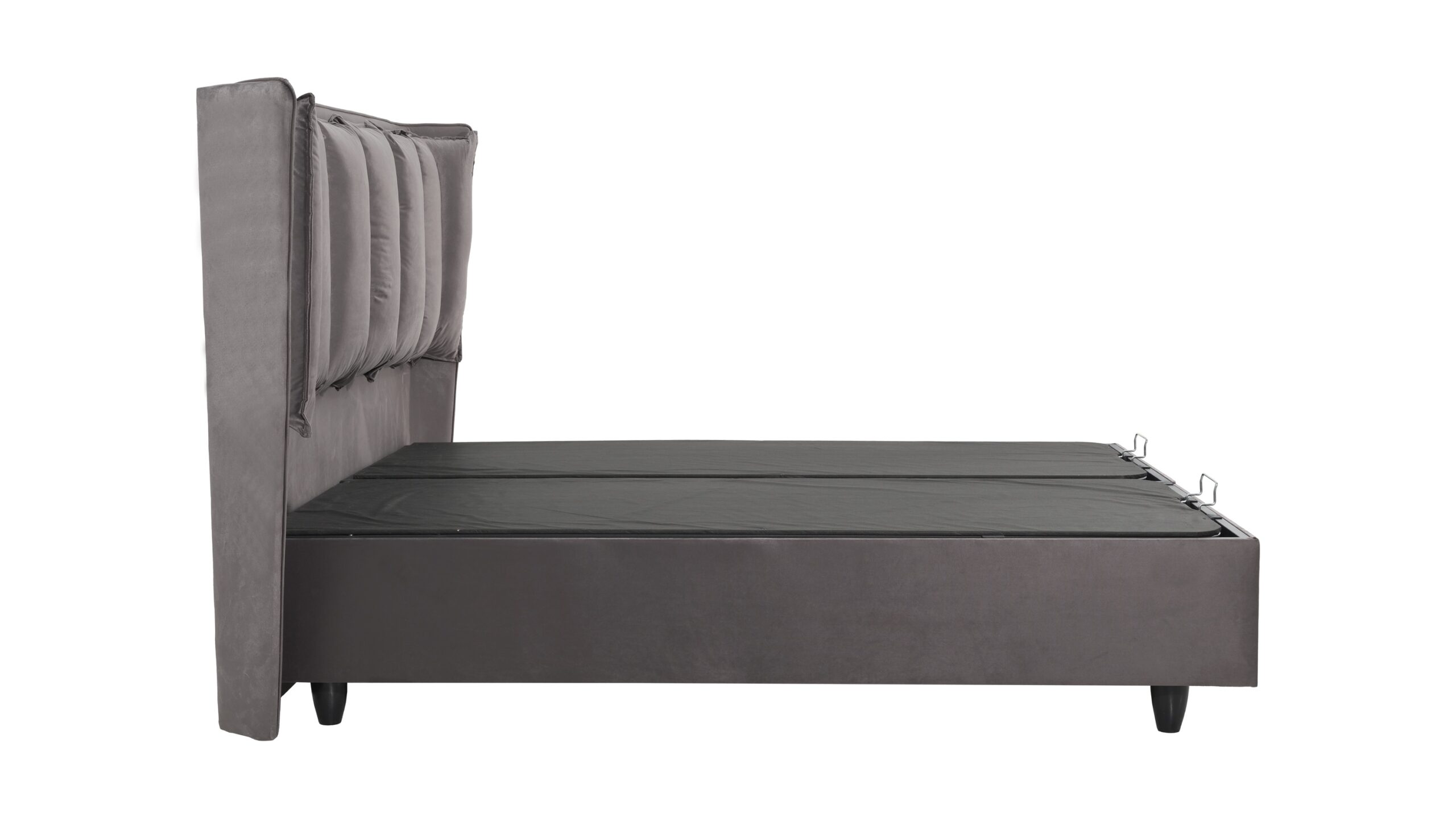 Κρεβάτι Alkioni Grey στιβαρή κατασκευή με 12 πόδια στην βάση του και μεταλλική βάση από στρατζαριστο σίδερο επενδεδυμένο με ξύλινο τελάρο και ύφασμα αλέκιαστο.